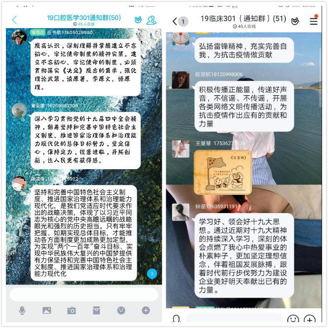 在各班團(tuán)支書(shū)的帶領(lǐng)下全體團(tuán)員學(xué)生在各班群里簽到,并在線上共同合唱國(guó)歌、團(tuán)歌,介紹此次團(tuán)日的意義。