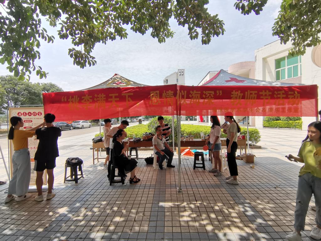 又一個收獲的季節(jié)碩果飄香,又一個期待的九月祝福飛揚,在秋韻蕩漾的日子里,我們迎來了第35個教師節(jié)。值此之際,為體現(xiàn)同學(xué)們對老師誠摯的祝福及感激之情,臨床醫(yī)學(xué)系學(xué)生會聯(lián)合康樂俱樂部于9月10日在明湖餐廳門口開展以”桃李滿天下,恩情似深?!睘橹黝}的教師節(jié)送祝?;顒?。大家為老師準(zhǔn)備了熱茶、咖啡、鮮花禮物及按摩緩解老師壓力。通過本次活動,同學(xué)們感受到老師默默耕耘、無私奉獻(xiàn)的精神,向老師表達(dá)了對他們的敬意,感謝老師的辛勤工作,“飲其流者懷其源,學(xué)其成時念吾師” 。老師,您辛苦了!