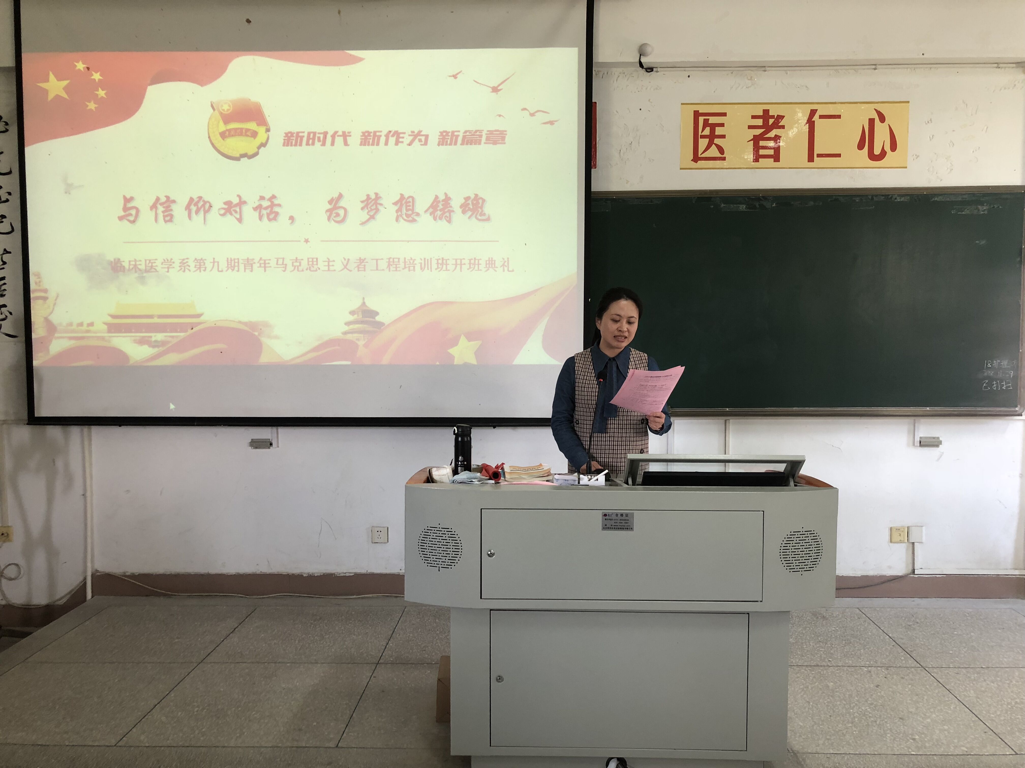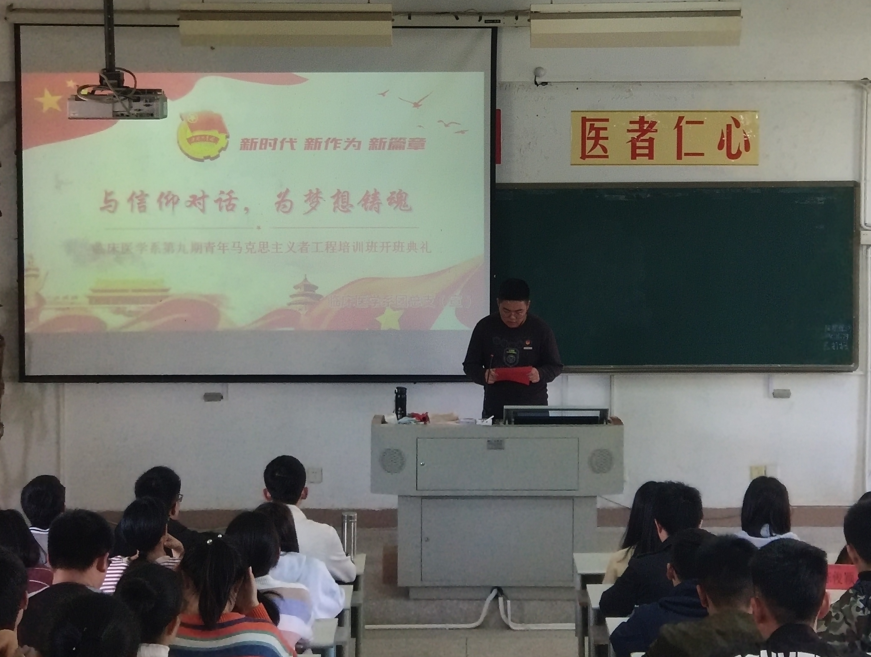 開班典禮由團(tuán)總支副書記王繼鑒同學(xué)的主持,在莊嚴(yán)的國歌聲中儀式正式開始。首先,由團(tuán)總支副書記謝林輝老師為本次開班儀式宣讀學(xué)員名單。學(xué)員代表王焱同學(xué)接著上臺表明未來的學(xué)習(xí)中要用實(shí)際行動的決心并具體提出青馬學(xué)員們應(yīng)在課程中完成的相應(yīng)學(xué)習(xí)任務(wù)。臨床醫(yī)學(xué)系黨總支陳俊穎副書記上臺講話并對學(xué)員們提出了寶貴的建議,一要堅定理想信念,擔(dān)當(dāng)歷史使命;二要貫穿思想教育,堅持理論與實(shí)踐相結(jié)合;三要汲取醫(yī)學(xué)知識,塑造良好品格,放飛青春夢想。開班儀式在國際歌中落下帷幕。