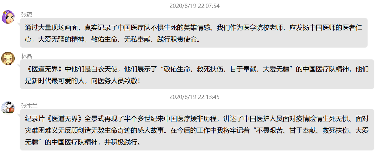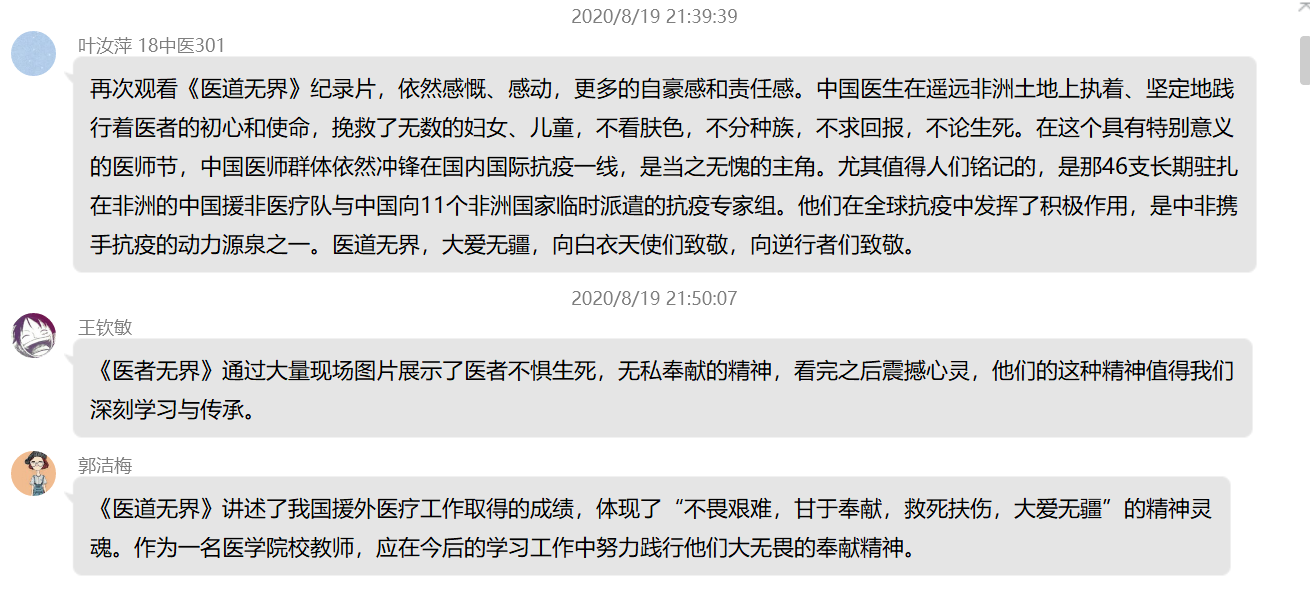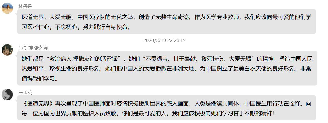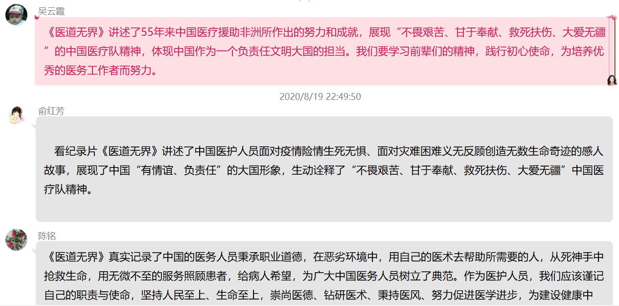 觀看之后,黨員紛紛發(fā)表感言,《醫(yī)道無界》體現(xiàn)了中國援外醫(yī)護(hù)人員不畏艱難、甘于奉獻(xiàn)、救死扶傷、大愛無疆的精神。我們作為醫(yī)學(xué)院校黨員教師,更應(yīng)在今后的工作中努力踐行和弘揚(yáng)這種大無畏的奉獻(xiàn)精神。在這個具有特別意義的醫(yī)師節(jié),中國醫(yī)師群體依然沖鋒在國內(nèi)國際抗疫一線,醫(yī)道無界、大愛無疆,向白衣天使們致敬,向逆行者們致敬。