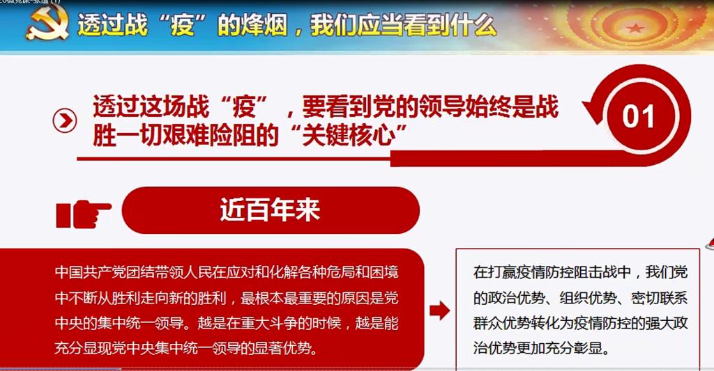 課間,黨員們也各抒己見,從這場(chǎng)“新冠肺炎”疫情的大考大戰(zhàn)面前,黨中央的堅(jiān)強(qiáng)領(lǐng)導(dǎo)和各級(jí)政府的高效應(yīng)急處置能力使這場(chǎng)總體戰(zhàn)、阻擊戰(zhàn)戰(zhàn)果顯著,讓我們備受鼓舞、信心滿懷。一方有難,八方支援,這場(chǎng)戰(zhàn)疫處處體現(xiàn)了中國(guó)集中力量辦大事的制度優(yōu)勢(shì)。這場(chǎng)疫情是一筆寶貴的財(cái)富,促使我們警醒、改變、奮進(jìn),使強(qiáng)國(guó)強(qiáng)軍在全國(guó)上下已在形成更廣泛的共識(shí)、更自覺(jué)的行動(dòng)。
