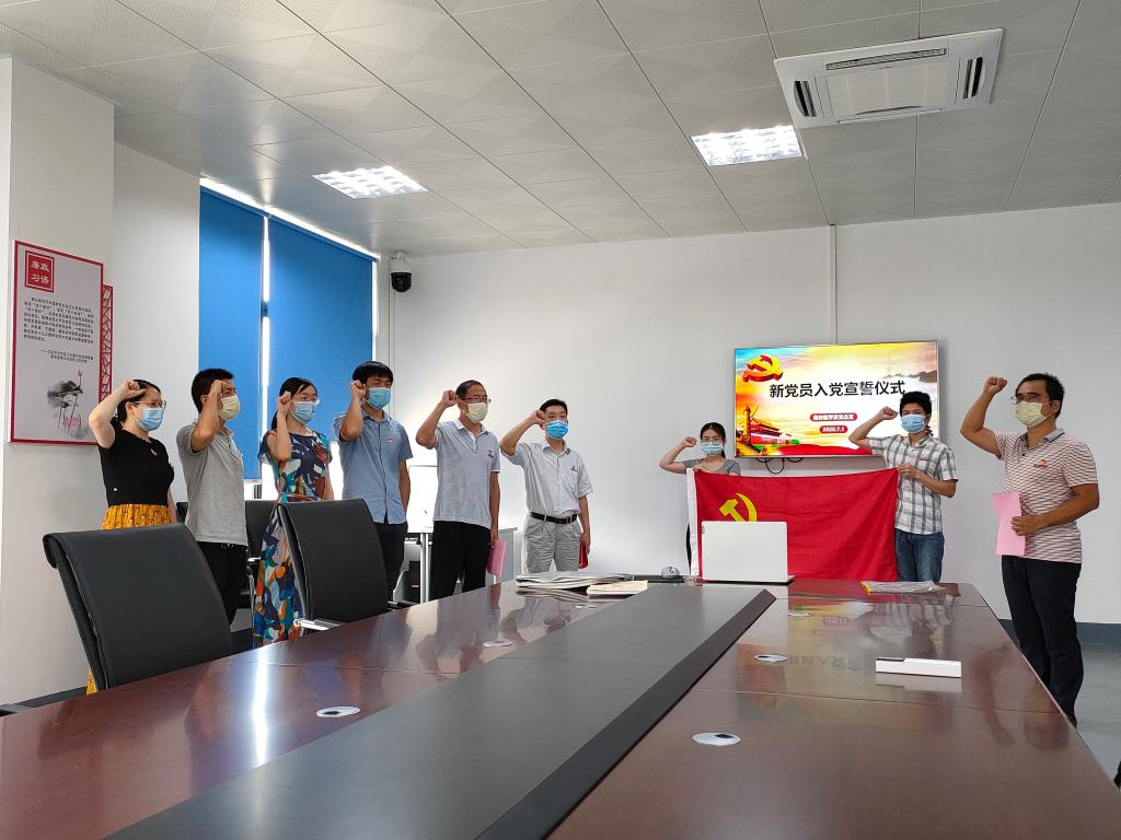 本次儀式由葉家濤主持,在莊嚴的《國際歌》中活動拉開帷幕。葉家濤宣讀新黨員名單并帶領(lǐng)他們在黨旗前莊嚴宣誓,表達了為黨的事業(yè)奮斗終身的決心,參加活動的老黨員也重溫了入黨誓詞。新黨員代表張藝婷同學發(fā)言,表示會永遠記住向黨和人民許下的鄭重承諾。老黨員代表朱翔書記分享自身感受并希望大家在疫情的特殊時刻也能成長起來,成為優(yōu)秀的黨員。黨總支副書記郭禮堅致辭,希望所有新黨員們不僅要在思想上、行為上入黨,更要牢記黨的宗旨,履行黨員義務(wù),在學思踐悟中堅定理想信念在奮發(fā)有為中踐行初心使命。
