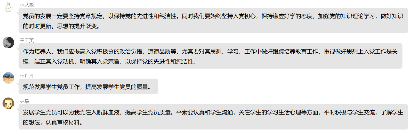 與會的黨員同志們紛紛表示,大學(xué)生黨員培養(yǎng)發(fā)展工作是高校全面提高大學(xué)生生活素質(zhì)和建設(shè)優(yōu)良育人環(huán)境的需要。從大學(xué)生群體中選擇優(yōu)秀分子,發(fā)展培養(yǎng)成為合格的中國共產(chǎn)黨黨員,能為我黨的肌體補(bǔ)充新鮮血液,是保持黨員隊伍生機(jī)和活力的需要,是我們黨保持蓬勃生機(jī)的重要保證,必須嚴(yán)格按照相關(guān)程序開展。同時,作為培養(yǎng)人,我們應(yīng)提高入黨積極分的政治覺悟、道德品質(zhì)等,尤其要對其思想、學(xué)習(xí)、工作中做好跟蹤培養(yǎng)教育工作,重視做好思想上入黨工作是關(guān)鍵,端正其入黨動機(jī),明確其入黨宗旨,以保持黨的先進(jìn)性和純潔性。