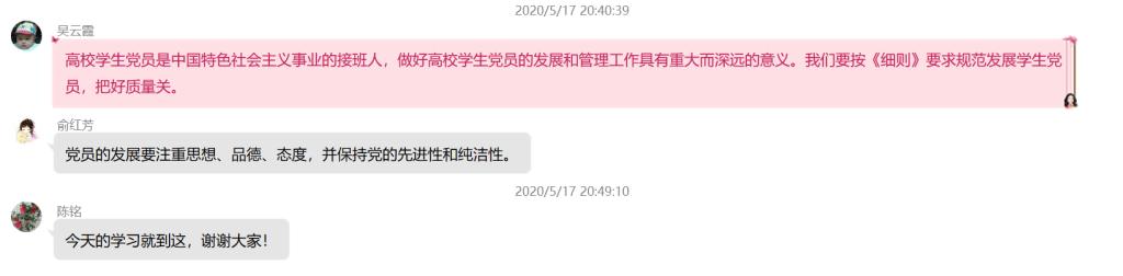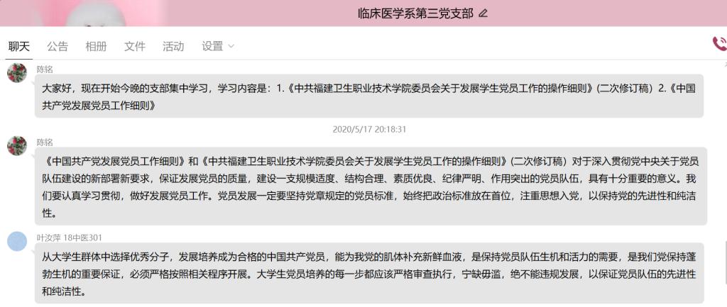 為讓全體黨員進(jìn)一步熟悉黨員發(fā)展流程,更有序、規(guī)范地開展學(xué)生黨員發(fā)展工作。5月17日晚,臨床系第三黨支部開展學(xué)習(xí)《中國共產(chǎn)黨發(fā)展黨員工作細(xì)則》和《中共福建衛(wèi)生職業(yè)技術(shù)學(xué)院委員會關(guān)于發(fā)展學(xué)生黨員工作的操作細(xì)則(二次修訂稿)》活動,此次學(xué)習(xí)活動由支部書記陳銘同志主持。