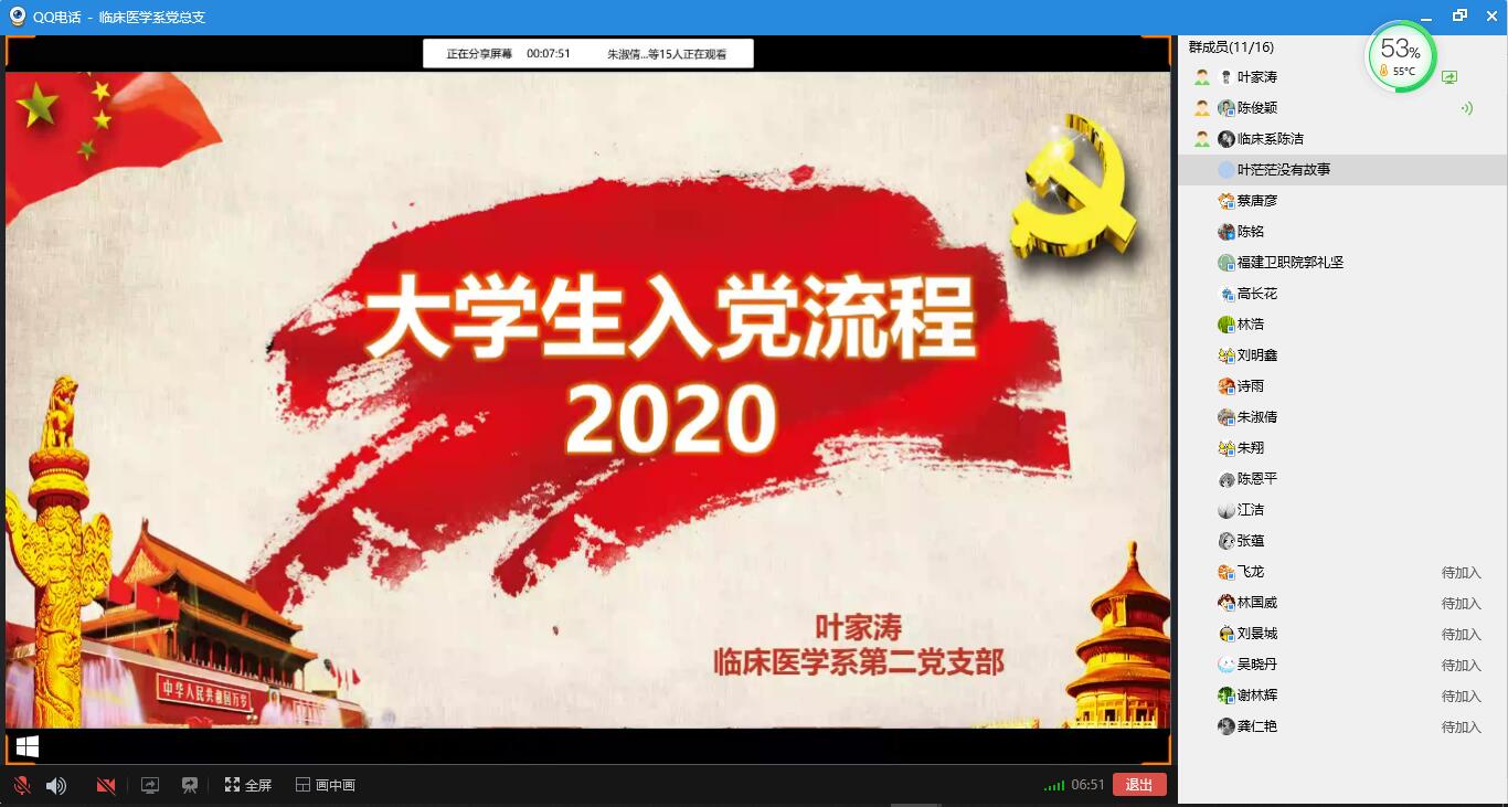 2020年5月14日,臨床醫(yī)學系黨總支專職組織員葉家濤同志結合自身工作,為總支委員和各支部支委做了《2020年入黨流程培訓》。