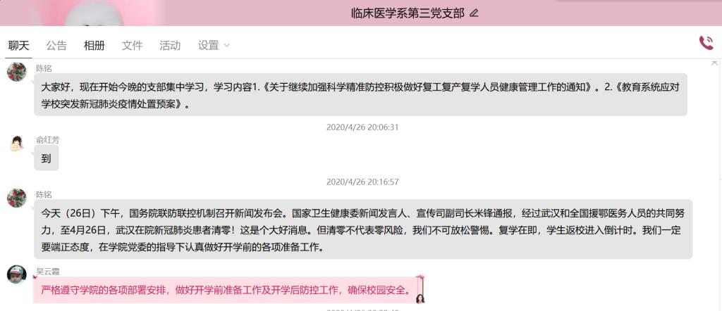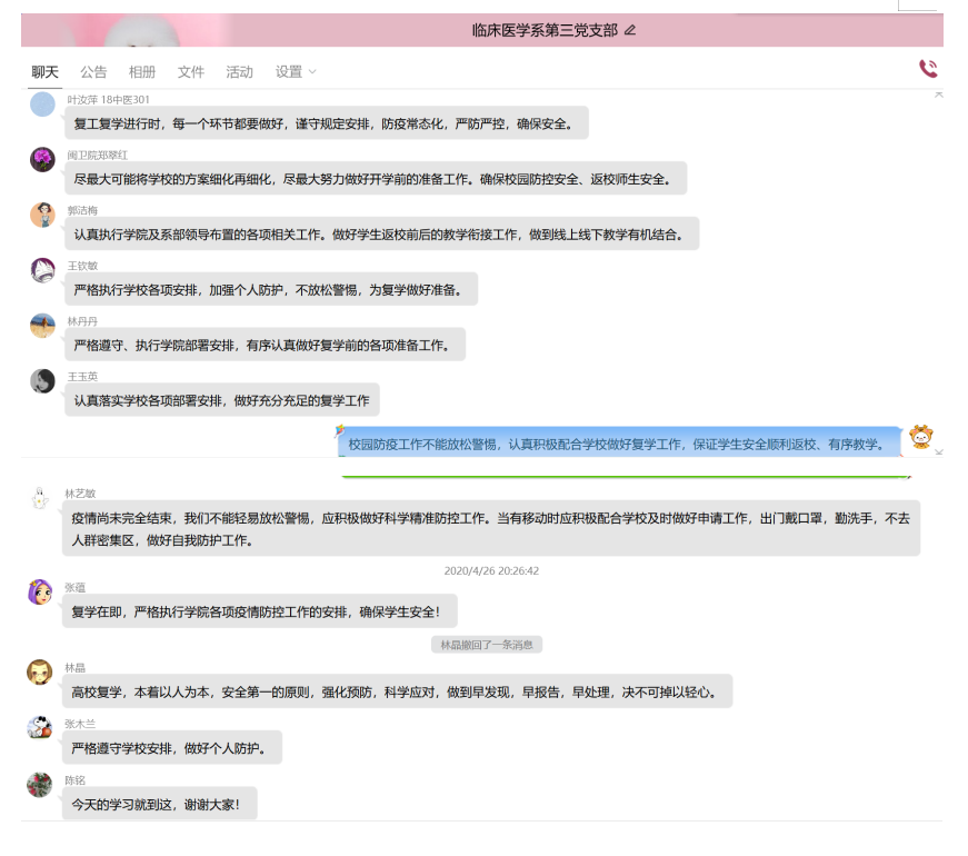 為有序推進(jìn)學(xué)生返校復(fù)學(xué)準(zhǔn)備工作,切實(shí)提升應(yīng)對(duì)突發(fā)疫情的應(yīng)急處置能力,4月26日晚,臨床系第三黨支部于線上開展《關(guān)于繼續(xù)加強(qiáng)科學(xué)精準(zhǔn)防控積極做好復(fù)工復(fù)產(chǎn)復(fù)學(xué)人員健康管理工作的通知》及《教育系統(tǒng)應(yīng)對(duì)學(xué)校突發(fā)新冠肺炎疫情處置預(yù)案》學(xué)習(xí)活動(dòng)。此次活動(dòng)由支部書記陳銘同志主持,支部全體黨員及預(yù)備黨員均參加。
