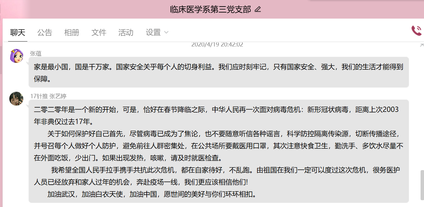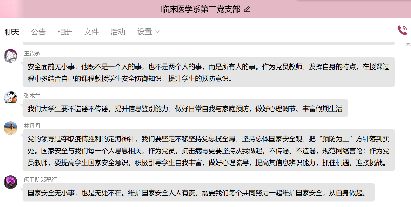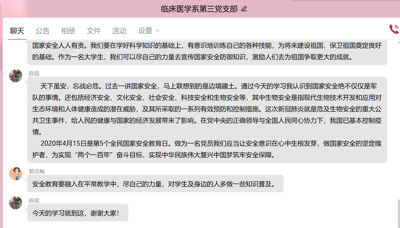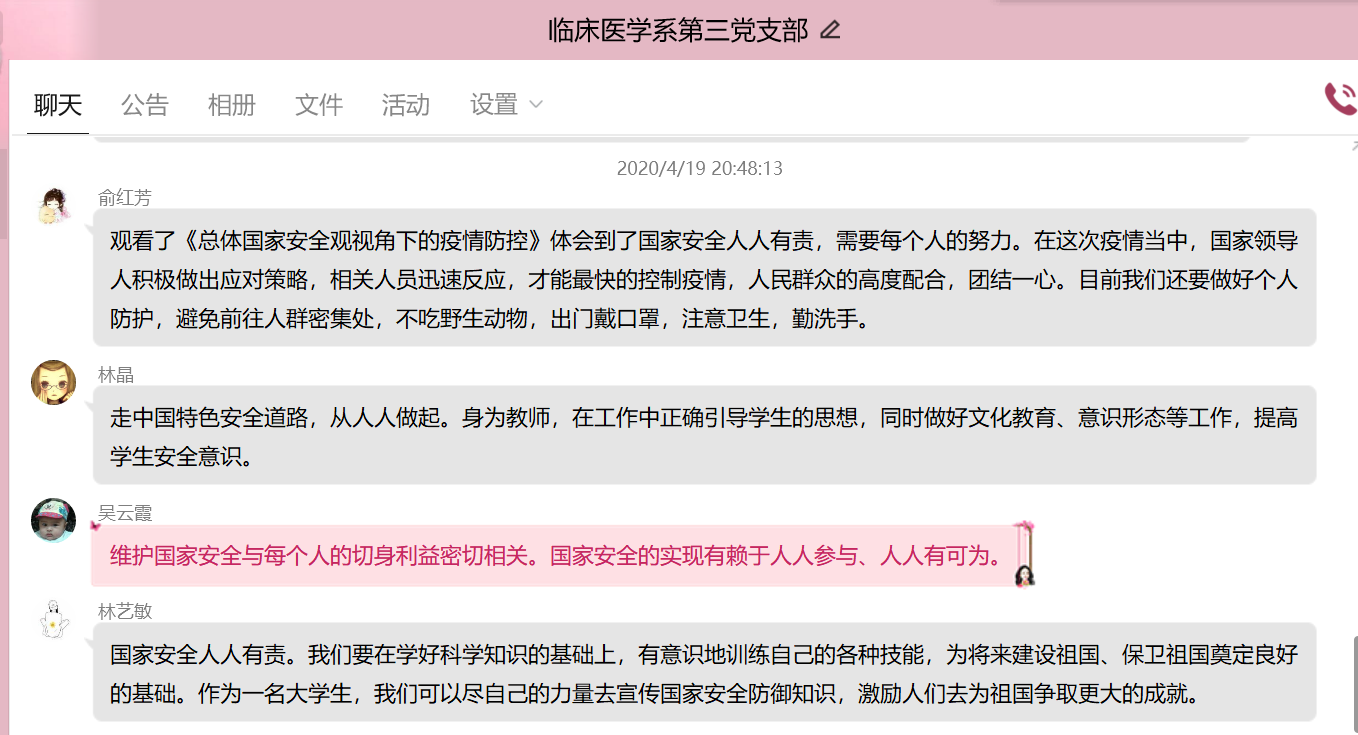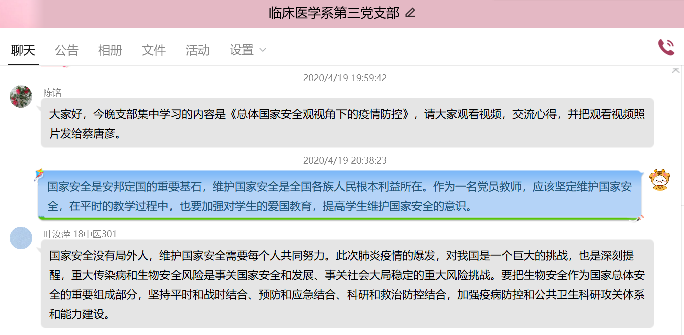 2020年4月15日是第5個全民國家安全教育日,今年的主題為“堅持總體國家安全觀,統(tǒng)籌傳統(tǒng)安全和非傳統(tǒng)安全,為決勝全面建成小康社會提供堅強保障”。為全面踐行總體國家安全觀,增強黨員國家安全意識,自覺維護國家安全,臨床醫(yī)學(xué)系第三黨支部在4月19日晚上開展線上觀看《總體國家安全觀視角下的疫情防控》視頻學(xué)習(xí)活動。此次活動由支部書記陳銘同志主持,支部全體黨員及預(yù)備黨員參加。