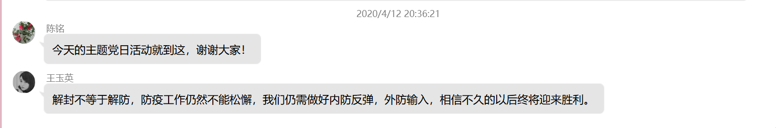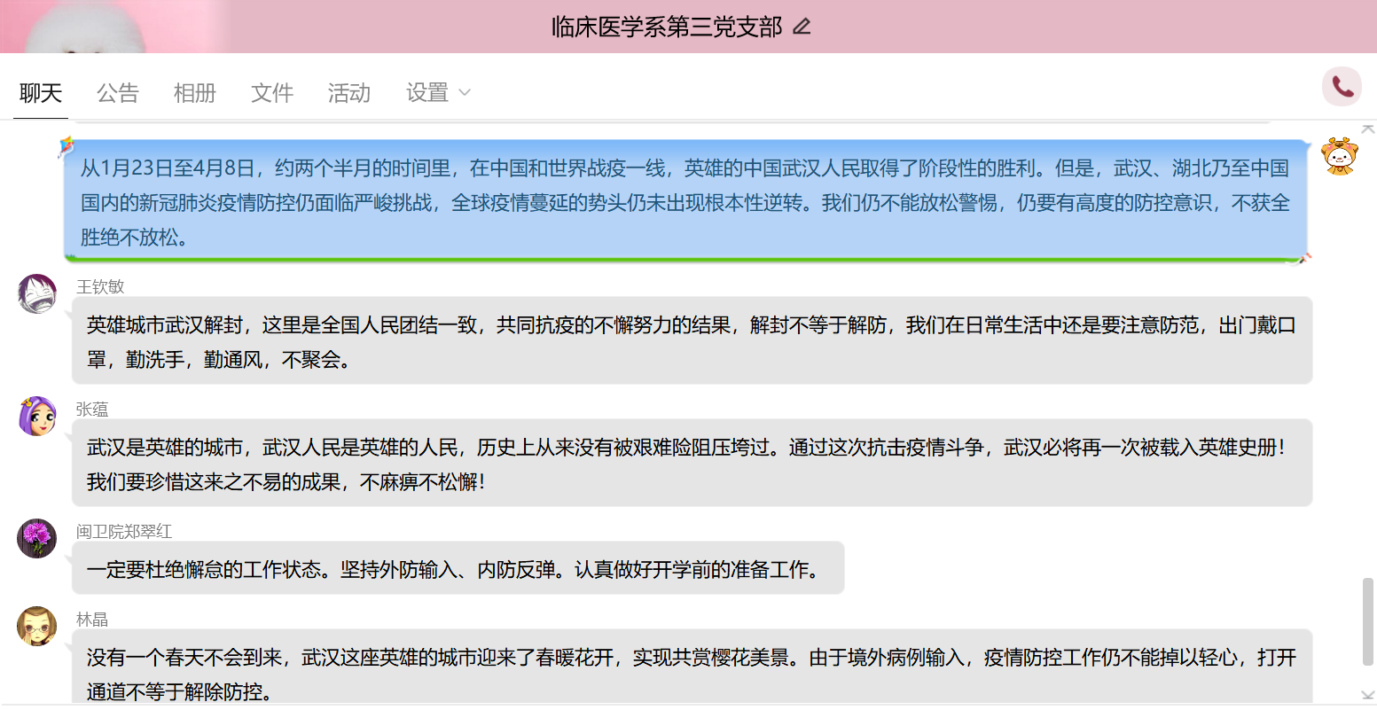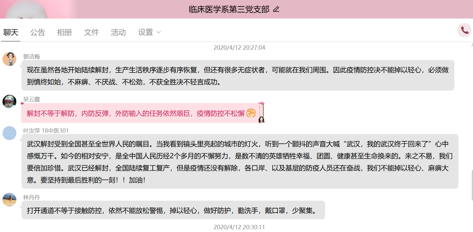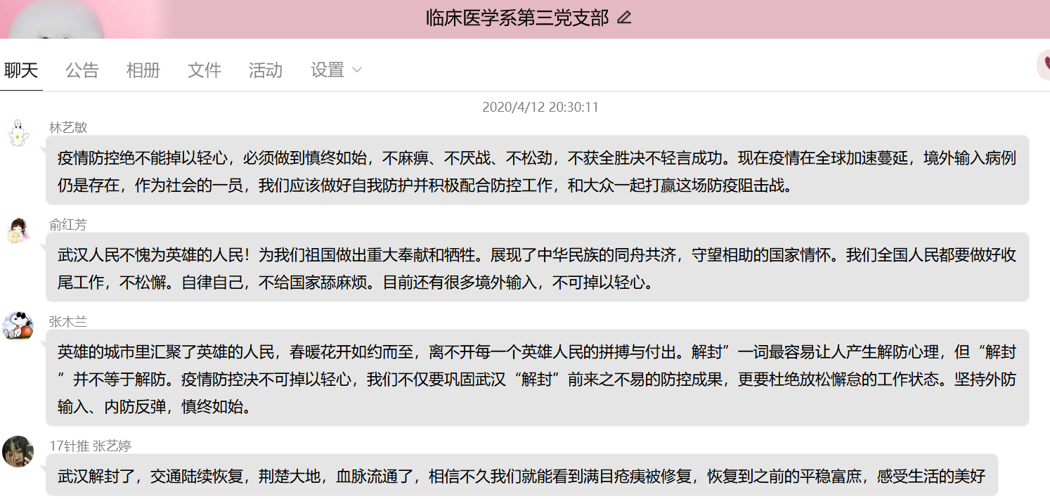 為更好地組織支部黨員學習,發(fā)揮黨員的先鋒模范作用。4月12日晚上,臨床醫(yī)學系第三黨支部開展學習《武漢戰(zhàn)“疫”日歷》、《慎終如始 防控不松——寫在武漢市解除離漢通道管控之際》、《打開通道不等于解除防控》等相關新聞報道的主題黨日活動,此次活動由支部書記陳銘同志主持,支部全體黨員及預備黨員均參加。