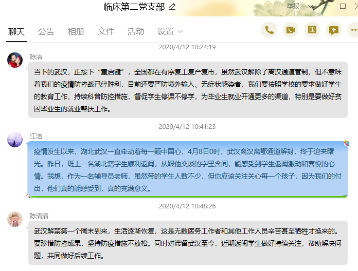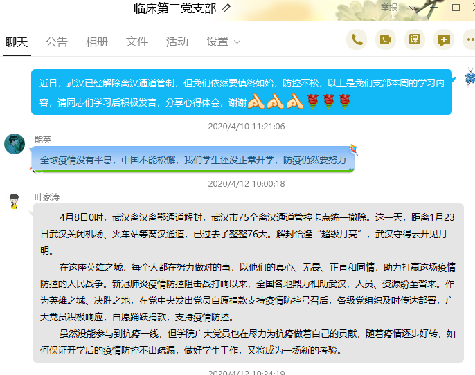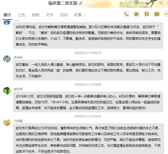 2020年4月12日,臨床醫(yī)學(xué)系第二黨支部組織全體黨員在線學(xué)習(xí),關(guān)于武漢解除管制措施,一起回顧了關(guān)閉離漢通道76個(gè)日日夜夜武漢人民的默默堅(jiān)守和勇敢付出,和戰(zhàn)疫期間一線工作英雄們的先進(jìn)事跡,以及關(guān)閉離漢通道76天后,積極戰(zhàn)疫取得階段性勝利的第一周,逐步蘇醒的武漢煙火氣等,展開交流學(xué)習(xí)。黨員同志們積極發(fā)表自己的見解,就當(dāng)前國(guó)際疫情形勢(shì)仍然嚴(yán)峻的情況下,工作開展應(yīng)該注意的事項(xiàng)進(jìn)行交流學(xué)習(xí)。