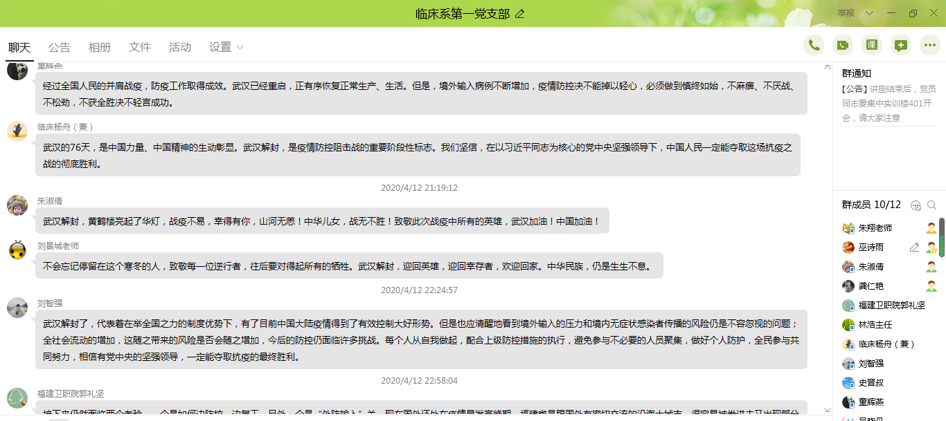 4月8日零時起,關(guān)閉離漢通道76天后,武漢市解除離漢離鄂通道管控措施。當(dāng)天,臨床醫(yī)學(xué)系第一黨支部組織在線學(xué)習(xí)了武漢解封的相關(guān)新聞和信息,并紛紛發(fā)表了自己的學(xué)習(xí)體會。