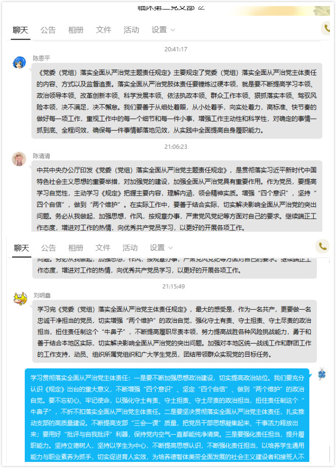 通過認(rèn)真自學(xué)并研讀文件,黨員同志們針對學(xué)習(xí)紛紛發(fā)表心得體會,在線上展開討論。