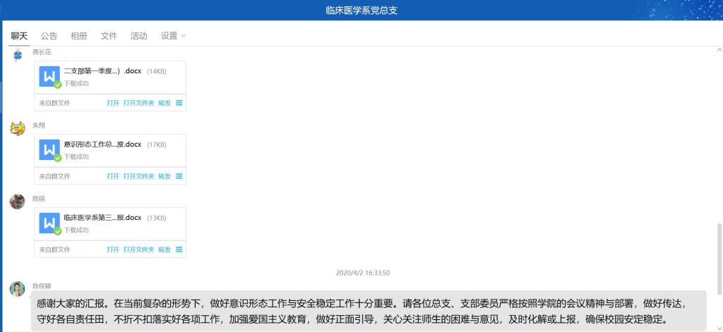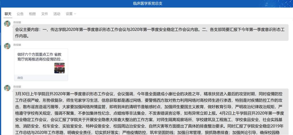 4月2日,臨床醫(yī)學(xué)系2020年第一季度意識(shí)形態(tài)及安全工作會(huì)議,同時(shí)4月份的黨支部書記例會(huì)于線上召開。系黨總支委員及支部書記參加會(huì)議,會(huì)議由黨總支負(fù)責(zé)人陳俊穎主持。