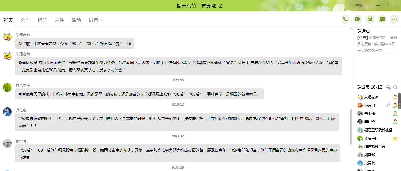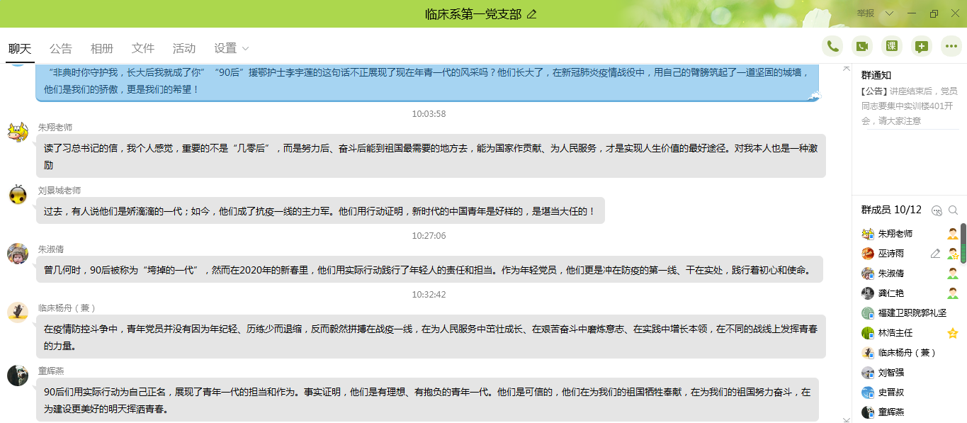 2020年3月19日上午,臨床醫(yī)學(xué)系第一黨支部組織在線學(xué)習(xí)習(xí)近平回信勉勵(lì)北京大學(xué)援鄂醫(yī)療隊(duì)全體“90后”黨員讓青春在黨和人民最需要的地方綻放絢麗之花。“在新冠肺炎疫情防控斗爭(zhēng)中,你們青年人同在一線英勇奮戰(zhàn)的廣大疫情防控人員一道,不畏艱險(xiǎn)、沖鋒在前、舍生忘死,彰顯了青春的蓬勃力量,交出了合格答卷。”3月15日,習(xí)近平總書(shū)記給北京大學(xué)援鄂醫(yī)療隊(duì)全體“90后”黨員回信,向他們和奮斗在疫情防控各條戰(zhàn)線上的廣大青年致以誠(chéng)摯的問(wèn)候。