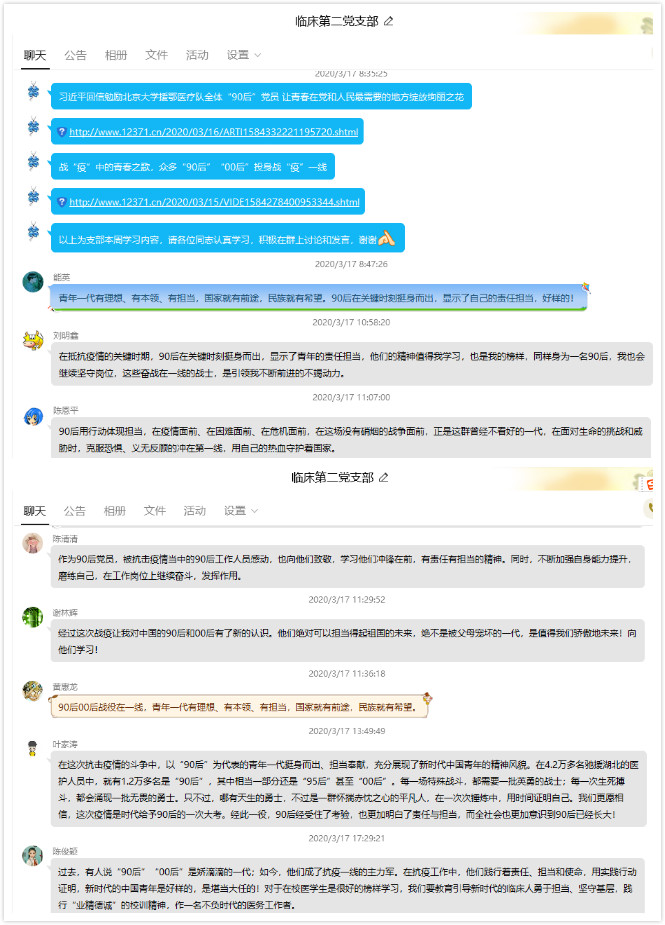 此次黨日活動,通過線上學(xué)習(xí)、交流討論等形式開展,認(rèn)真?zhèn)鬟_(dá)了習(xí)近平總書記的回信內(nèi)容。在這次抗擊疫情斗爭中,眾多“90后”“00后”投身戰(zhàn)“疫”一線,不畏艱險、沖鋒在前、舍生忘死,展現(xiàn)出一往無前的青春力量,廣大青年用行動證明,新時代的中國青年是好樣的,是堪當(dāng)大任的!