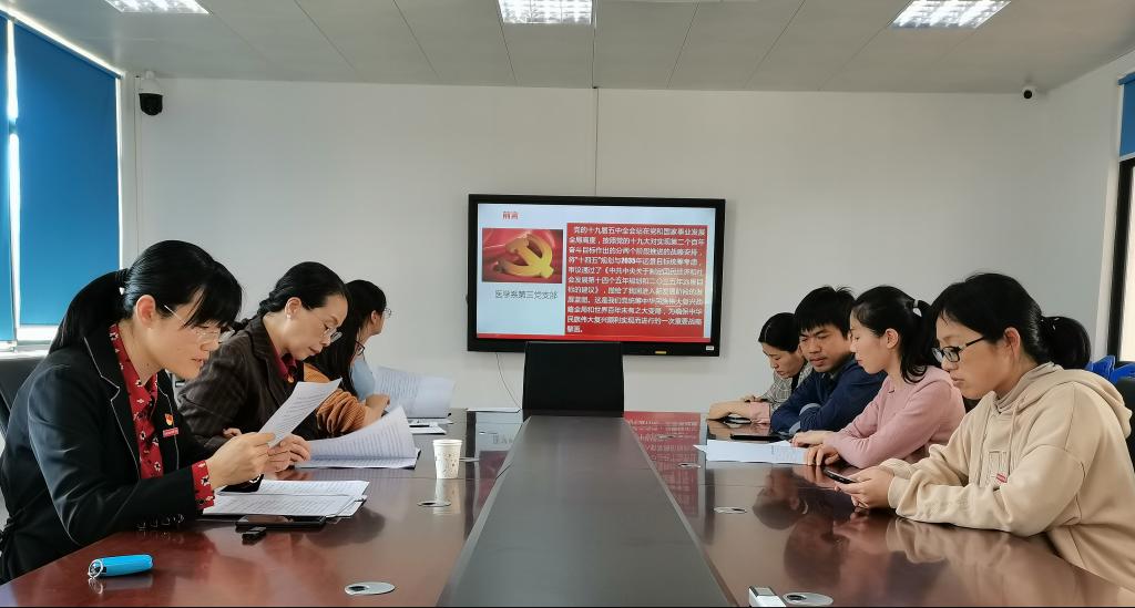 為深入學習黨的十九屆五中全會精神,2020年11月26日中午,醫(yī)學系第三黨支部副書記張?zhí)N同志在實訓樓311會議室開展《黨的十九屆五中全會的全局性、歷史性意義》專題黨課的講授,學院黨委委員、副院長鄭翠紅與支部其他黨員一起參加本次的學習。