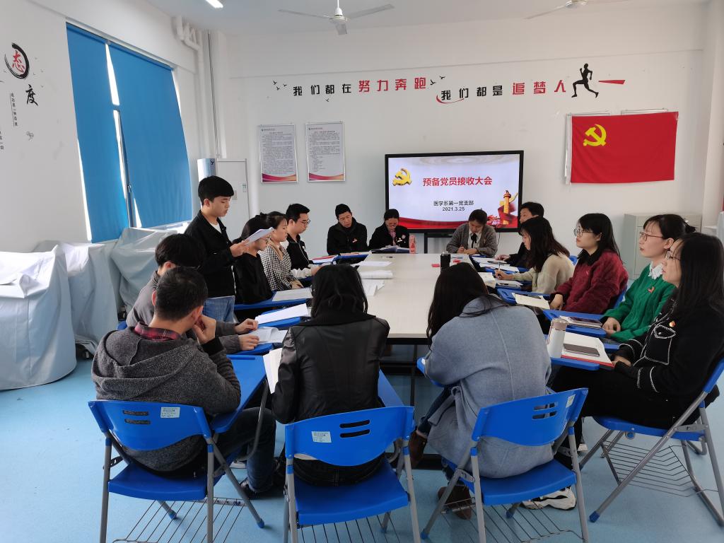 2021年3月25日中午,醫(yī)學(xué)系第一黨支部在實(shí)訓(xùn)樓401召開接收預(yù)備黨員大會。會議由支部書記朱翔主持,支部2名教師預(yù)備黨員及11名正式黨員全部參會。