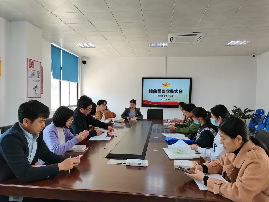 2021年3月25日中午,醫(yī)學系第三黨支部在實訓樓311室召開接收預備黨員大會。會議由支部書記陳銘主持,支部11名正式黨員因事請假2人,其余9名黨員全部參會。
