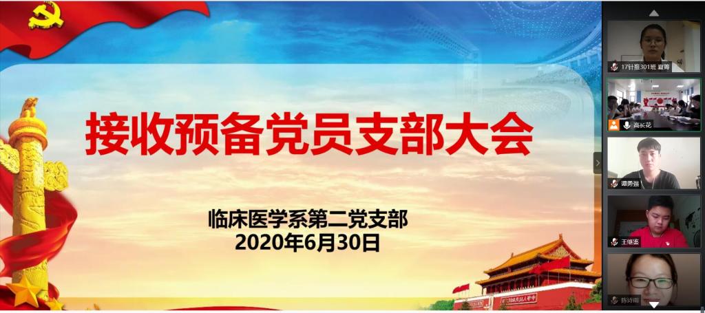 2020年6月30日下午,臨床醫(yī)學(xué)系第二黨支部采用線上結(jié)合線下的方式召開接收預(yù)備黨員大會。本次會議是嚴(yán)格按照黨章和發(fā)展黨員的規(guī)定,按組織程序,經(jīng)上級黨委批準(zhǔn),召開關(guān)于討論接收馬慧芯等6位同志為中共預(yù)備黨員的支部大會。