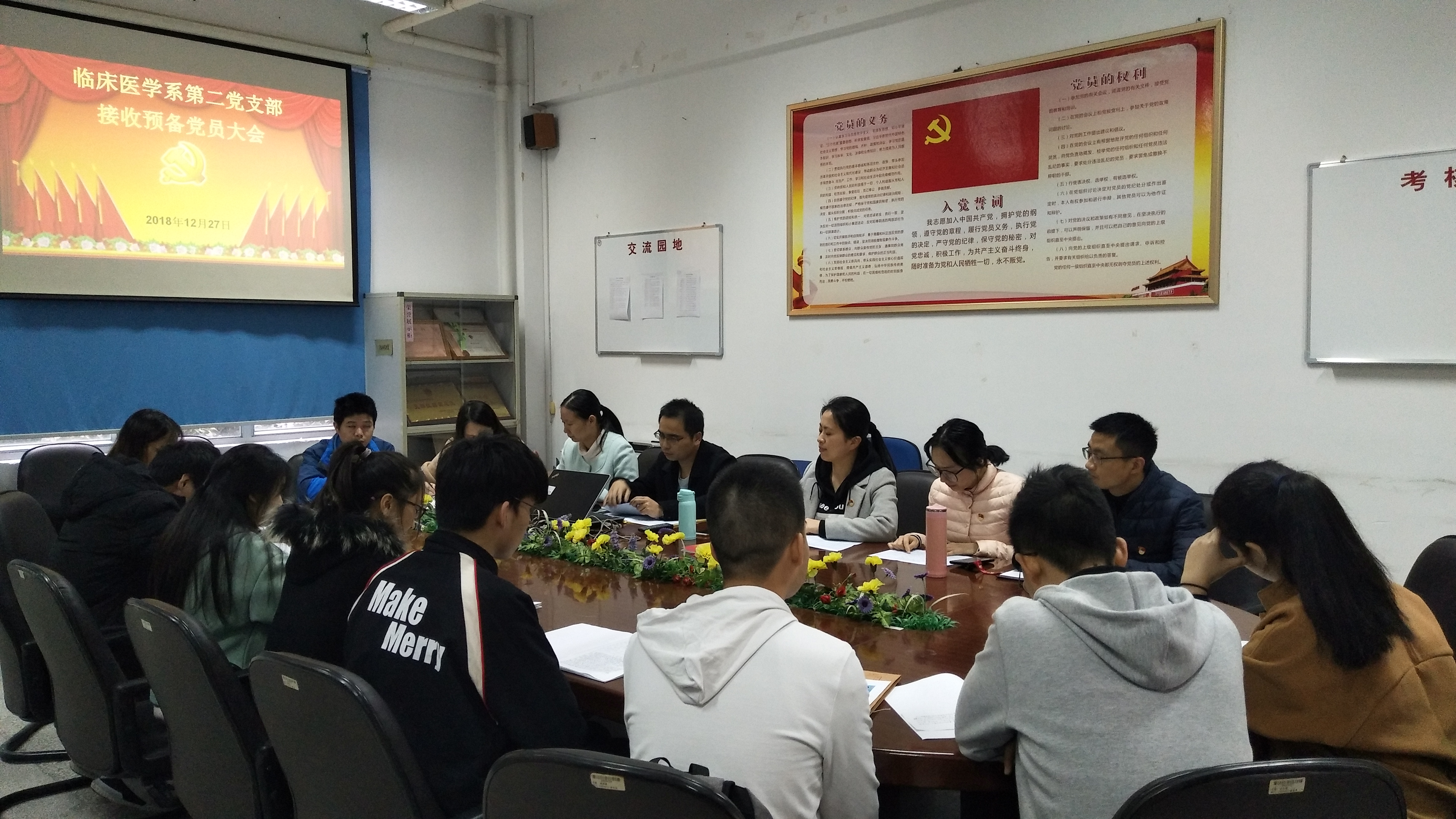 2018年12月27日上午,臨床醫(yī)學(xué)系第二黨支部在基礎(chǔ)部會(huì)議室召開接收預(yù)備黨員大會(huì)。會(huì)議由支部書記葉家濤主持,支部7名正式黨員全部與會(huì)。