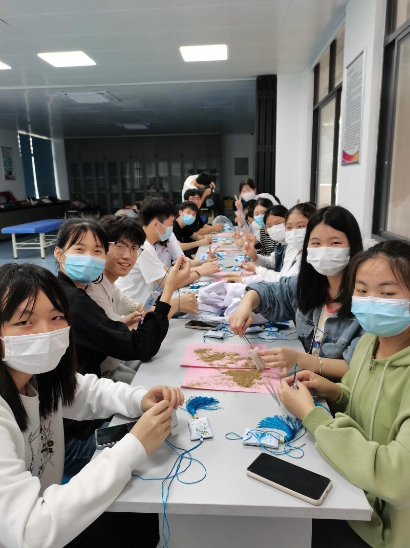 聽(tīng)完老師的講解后,同學(xué)們對(duì)中藥材神奇功效的認(rèn)知得到了驗(yàn)證與加深,產(chǎn)生了更濃厚的興趣。大家三倆成組,相互配合,將已打磨成藥粉的中藥材放入囊袋之中,并扎緊固定起來(lái)。在老師細(xì)心的指導(dǎo)與同學(xué)的配合下,一個(gè)個(gè)飽滿又精致的中藥香囊呈現(xiàn)在大家眼前,空氣中彌漫著清幽的香氣?!按鱾€(gè)香草袋,不怕五毒害”,端午節(jié)這天,佩戴香囊,不但有避邪驅(qū)瘟之意,又有襟頭點(diǎn)綴之風(fēng)。傳統(tǒng)節(jié)日“端午”將至,同學(xué)們對(duì)親手制作如此“應(yīng)景”的藥囊愛(ài)不釋手。