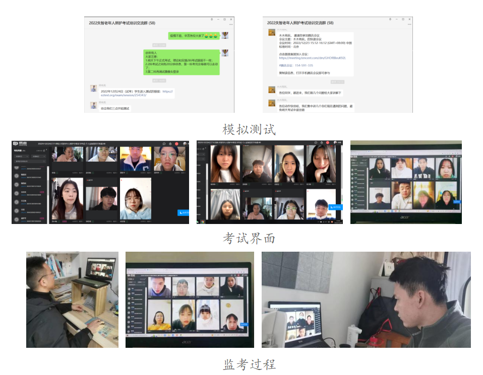 2022年12月24日,醫(yī)學(xué)院承辦的教育部“1+X”失智老年人照護職業(yè)技能等級考試順利開展,來自醫(yī)學(xué)院2020級康復(fù)治療技術(shù)專業(yè)的47名同學(xué)參加了該項目考試。為克服疫情不利影響,醫(yī)學(xué)院特與項目負責(zé)組織進行了充分溝通、爭取到以線上形式開展考試,最大程度保障學(xué)生的人身安全及復(fù)習(xí)成效??记?,康復(fù)治療技術(shù)教研室教師嚴格按照考試相關(guān)要求,開展操作說明及模擬測試,同學(xué)們積極配合、認真?zhèn)淇?。考試運用易考平臺開展,在校領(lǐng)導(dǎo)的高度重視和監(jiān)考老師及學(xué)生的共同努力下,考生專心作答、監(jiān)考老師嚴格考評、督導(dǎo)員遠程監(jiān)察,考評全程在縝密籌備中有序完成。