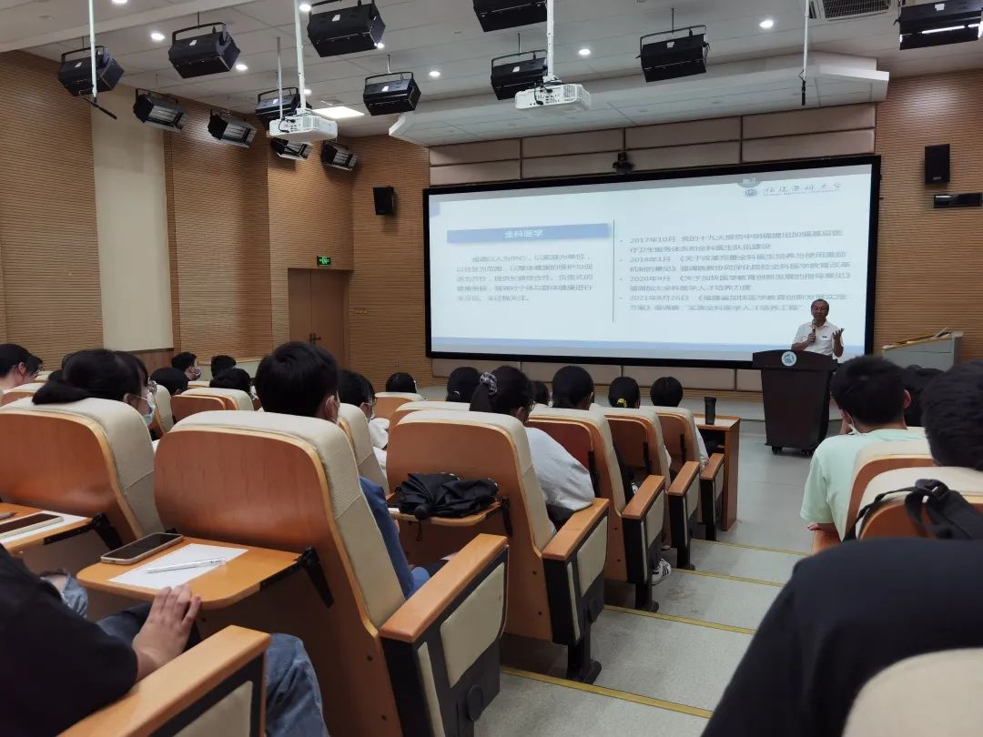 講座中,劉豫瑞從全科醫(yī)學(xué)的發(fā)展背景、發(fā)展態(tài)勢和發(fā)展定位三個方面,結(jié)合國家層面出臺的全科醫(yī)學(xué)教育改革、人才培養(yǎng)的方針政策,為同學(xué)們詳細解答全科醫(yī)學(xué)是什么、全科醫(yī)學(xué)的發(fā)展為什么越來越受到重視。劉豫瑞指出,當(dāng)前新冠肺炎疫情形勢復(fù)雜多變,疫情當(dāng)前,社區(qū)全科醫(yī)生仍不充足。同時,劉豫瑞介紹了福建醫(yī)科大學(xué)健康學(xué)院專業(yè)設(shè)置及發(fā)展目標(biāo),希望臨床醫(yī)學(xué)(高本貫通)專業(yè)同學(xué)未來努力通過轉(zhuǎn)段選拔,實現(xiàn)德智體美勞全面發(fā)展,順利進入福建醫(yī)科大學(xué)健康學(xué)院的全科醫(yī)學(xué)系繼續(xù)學(xué)習(xí)探索,共同致力于“讓百姓不得病、少得病,不得大病、慢得病”的基層全科醫(yī)療發(fā)展目標(biāo)。