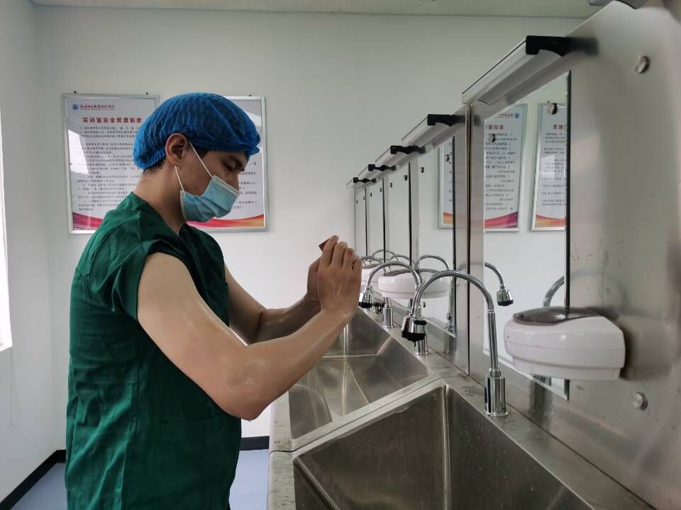此次活動(dòng)由劉景城老師主講,首先她根據(jù)教學(xué)目標(biāo)、臨床執(zhí)業(yè)助理醫(yī)師考試要求、臨床實(shí)踐操作要求,并參照《醫(yī)師資格考試大綱》(2019年版),將手術(shù)刷手法進(jìn)行了分步驟講解,并對(duì)強(qiáng)調(diào)操作過(guò)程的注意事項(xiàng);隨后由劉智強(qiáng)老師指導(dǎo),黃騰斌老師在新實(shí)訓(xùn)樓模擬手術(shù)室內(nèi)演示臨床外科常用手術(shù)刷手法操作流程。操作結(jié)束后,各位老師就傳統(tǒng)的肥皂水刷手法的沿用和演變、目前臨床上手術(shù)刷手的新方法、不同刷手方法的組合選擇以及手術(shù)刷手法的基本原則等問(wèn)題就操進(jìn)行深入探討,大家積極發(fā)表意見(jiàn),總結(jié)出較為合理的操作方法,改進(jìn)與完善實(shí)訓(xùn)課教學(xué),以提高學(xué)生的臨床實(shí)踐操作技能。