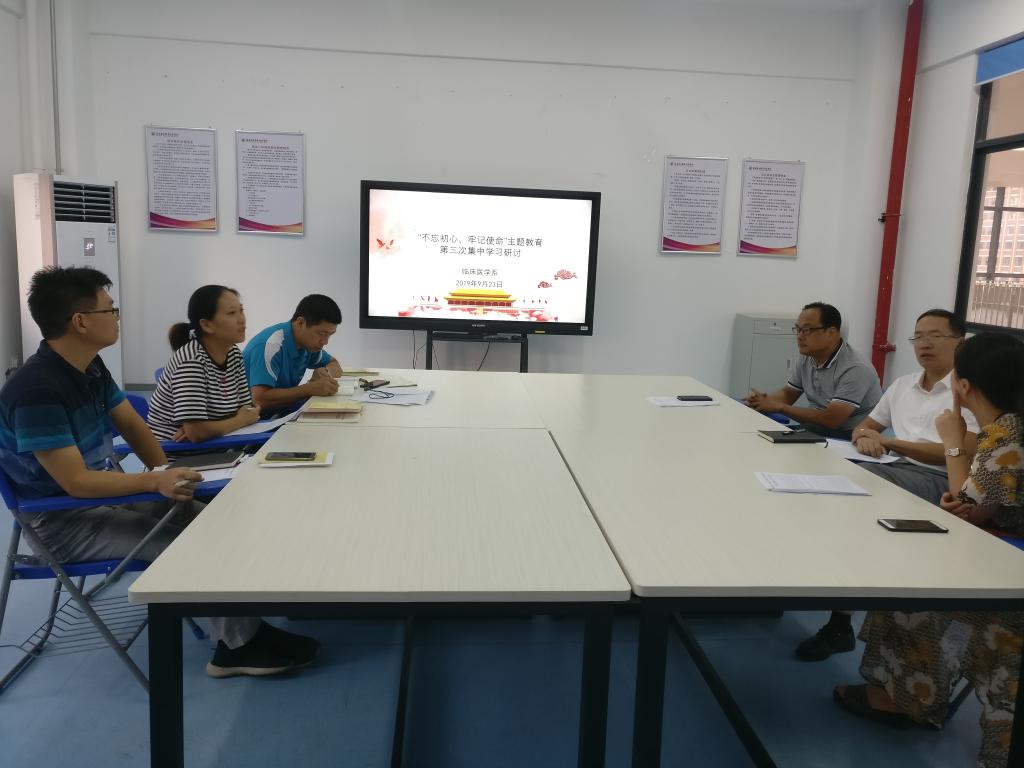 2019年9月23日下午,臨床醫(yī)學(xué)系黨總支在實(shí)訓(xùn)樓401召開“不忘初心、牢記使命”主題教育第三次集中學(xué)習(xí)研討,本次研討的主題是:踐行初心使命,增強(qiáng)斗爭(zhēng)意志。研討會(huì)由系黨總支負(fù)責(zé)人陳俊穎主持。
