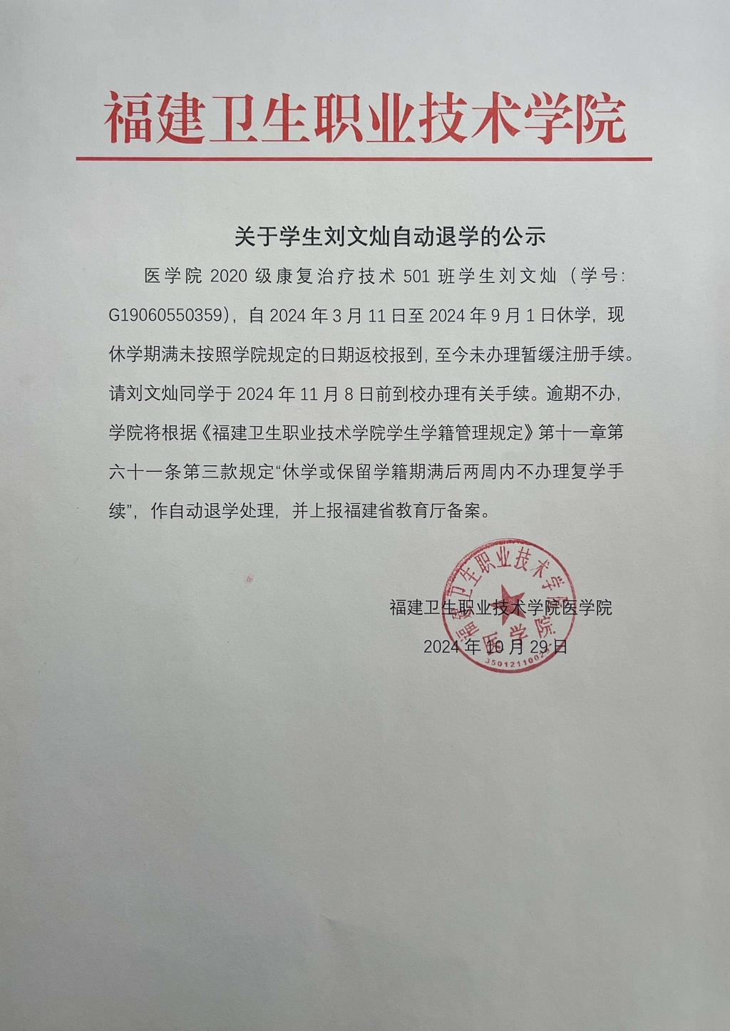 關(guān)于學(xué)生劉文燦自動(dòng)退學(xué)的公示