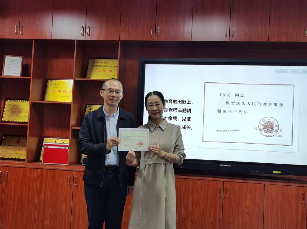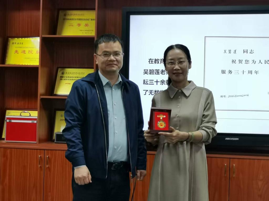最后,傅衍達(dá)書記和鄧元榮院長分別為吳碧蓮老師頒發(fā)從教榮譽(yù)證書和退休紀(jì)念章,全體教職工以熱烈掌聲向這位堅守初心的教育者致以最高敬意。