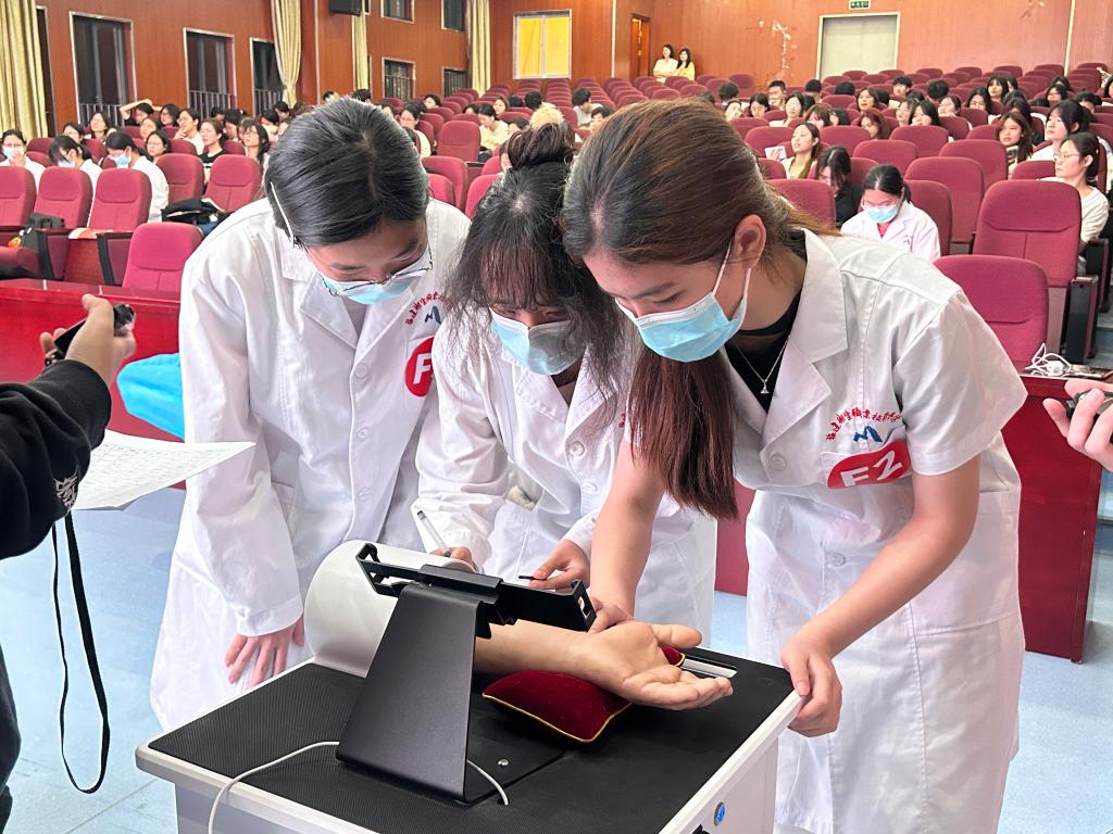 比賽現(xiàn)場氣氛緊張而有序,選手們精神飽滿、沉著應(yīng)對,展現(xiàn)出良好的專業(yè)素養(yǎng)。在舌診與脈診環(huán)節(jié),同學(xué)們通過觀察圖片及操作智能脈診設(shè)備,細(xì)致辨識脈象與舌象;在推拿和針刺操作中,更是動作嫻熟、規(guī)范到位,體現(xiàn)了扎實(shí)的臨床實(shí)訓(xùn)成果。