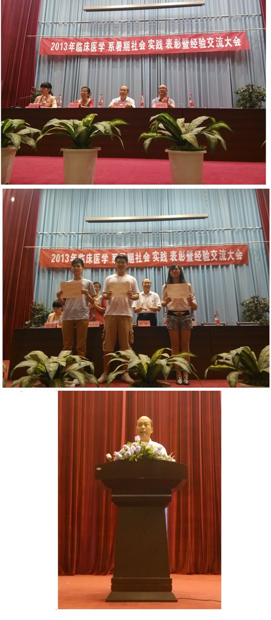 表彰會上,系團總支書記邱萍老師宣讀了對本次暑期社會實踐“三下鄉(xiāng)”活動的“優(yōu)秀個人獎”、“優(yōu)秀團隊獎”及“優(yōu)秀社會實踐報告獎”給于表彰的決定,并請與會領(lǐng)導(dǎo)給獲獎的優(yōu)秀團隊及優(yōu)秀個人頒獎。接著,獲獎代表12康復(fù)302班林桂芳、12臨床303班林惠坊和12臨床301班張惠強三位同學(xué)分別上臺發(fā)言,分享各自在活動中的體會及收獲,紛紛表示在接下來的學(xué)習(xí)中堅持書本與實踐相結(jié)合,發(fā)奮圖強,堅定獻身醫(yī)學(xué)的信念。