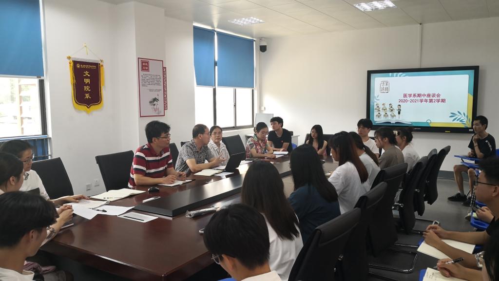 為促進(jìn)師生的溝通與交流,收集學(xué)生在前半學(xué)期課堂教學(xué)中遇到的問(wèn)題,醫(yī)學(xué)系于2021年5月27日中午在實(shí)訓(xùn)樓311會(huì)議室召開(kāi)期中座談會(huì)。參加此次會(huì)議的有學(xué)校質(zhì)量管理辦公室主任郭禮堅(jiān)、副主任王珊珊、校督導(dǎo)李冬秀,醫(yī)學(xué)系副主任陳銘、林浩,系辦公室主任劉能英以及醫(yī)學(xué)系19、20級(jí)各班學(xué)委代表。