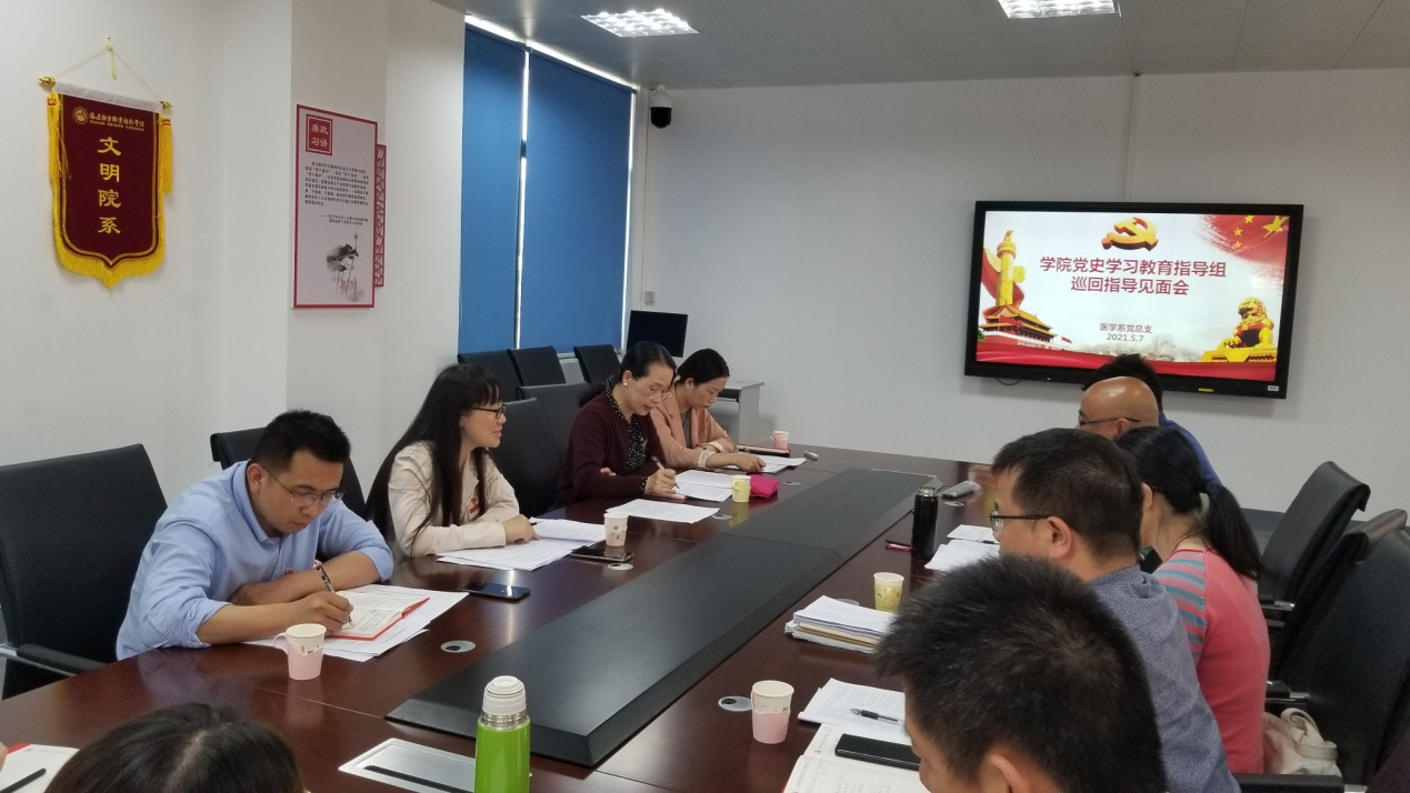 根據(jù)學校黨史學習教育工作的安排,5月7日下午,由校黨委委員、副院長鄭翠紅帶隊的學校黨史學習教育指導小組深入醫(yī)學系黨總支指導黨史學習教育第一階段工作情況。