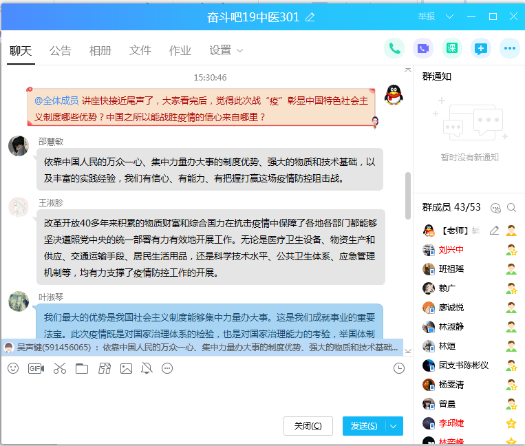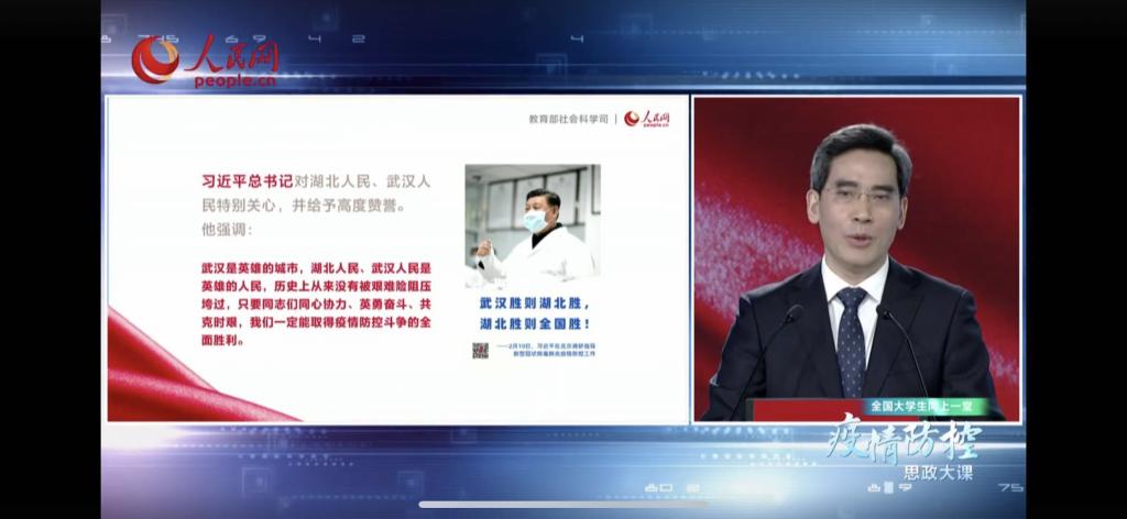 由于網(wǎng)絡(luò)擁擠,許多同學(xué)無法進(jìn)入直播,努力嘗試各種平臺同步看到了炙手可熱的“全國大學(xué)生同上一堂疫情防控思政大課”。艾四林教授“在抗擊疫情斗爭中深化理論認(rèn)識”。立足中國抗擊疫情的具體實踐,引導(dǎo)學(xué)生深化對馬克思主義基本理論的認(rèn)識、深化對馬克思主義中國化最新成果的認(rèn)識。秦宣教授“疫情大考告訴我們什么”。分析中國抗疫彰顯的中國共產(chǎn)黨領(lǐng)導(dǎo)和中國特色社會主義制度的顯著優(yōu)勢。王炳林教授“總結(jié)歷史經(jīng)驗,增強(qiáng)必勝信心”。從我國歷史上的防疫斗爭歷程出發(fā),分享從磨難中奮起、化危機(jī)為轉(zhuǎn)機(jī)的歷史經(jīng)驗和智慧。馮秀軍教授“戰(zhàn)‘疫’里的最美青春——談中國青年的責(zé)任與擔(dān)當(dāng)”以戰(zhàn)“疫”里的青年責(zé)任與擔(dān)當(dāng)為主題,深情講述這場疫情中勇敢逆行的年輕風(fēng)景,引導(dǎo)大學(xué)生群體擔(dān)當(dāng)歷史使命,將青春夢想扎根祖國的廣袤大地。