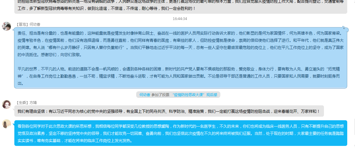 課程結(jié)束,同學(xué)們反響熱烈,在輔導(dǎo)員及班委的組織下同學(xué)們在線上進(jìn)行了積極討論。