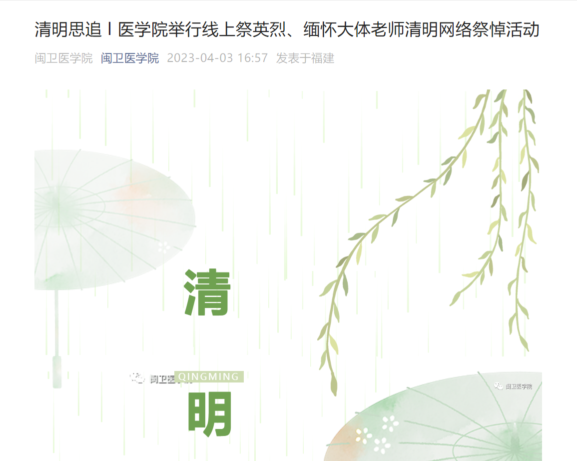 本次清明專題紀念活動前期,醫(yī)學院教師第二黨支部、醫(yī)學院團總支開展線上祭英烈、緬懷大體老師清明網絡祭悼活動,并制作了追思推文,發(fā)布于醫(yī)學院公眾號,號召同學們一同學習緬懷。線上線下同步推廣,擴大了活動的參與面,讓更多的同學一同撫今追昔思奮進。