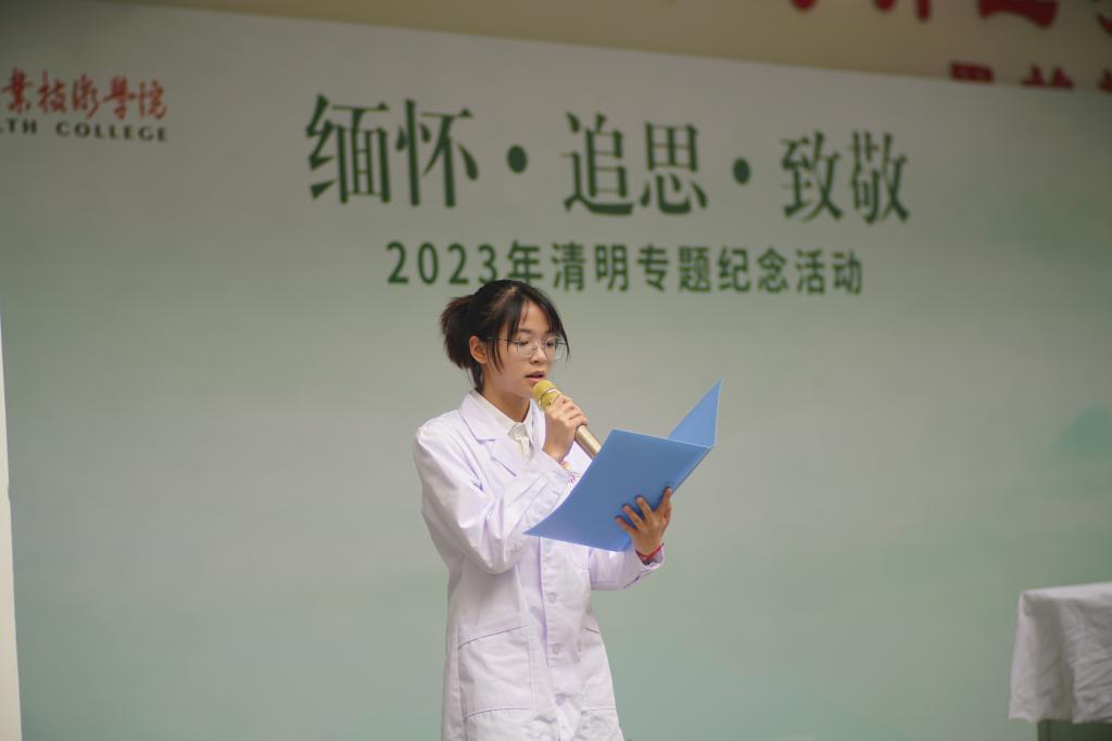 活動現場氣氛莊嚴、肅穆。主持人飽含深情地介紹在傳統(tǒng)節(jié)日清明節(jié)開展追思活動的重要意義,全體師生集體行默哀禮,緬懷先賢。隨后,伴著緩緩的輕音樂,散文詩朗誦《緬懷?追思?致敬》喚起大家濃濃的思緒,表達了對無言良師的敬佩與感激。醫(yī)學院學生代表還分享了《長征中走出的紅色軍醫(yī)——徐根竹》的事跡,帶領大家在故事中感悟“紅醫(yī)精神”。