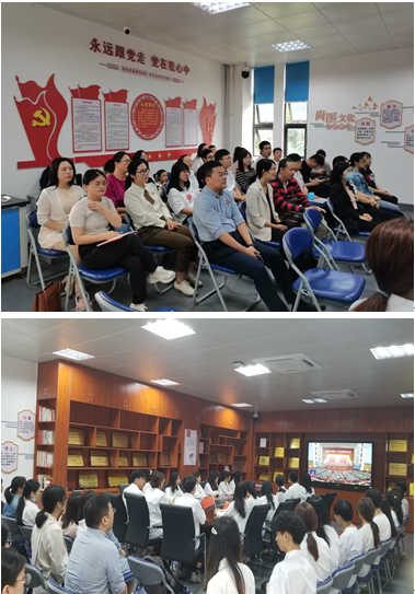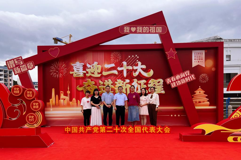 會后,在支部書記鄧元榮同志的帶領(lǐng)下,黨員同志在學(xué)校精心設(shè)置的主題陳展架前合影,記錄下這一心潮澎湃的激動時刻。