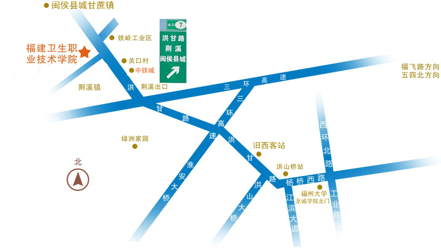 5.自駕車路線:①從三環(huán)路往南平、閩侯方向到荊溪出口(閩侯縣城、洪甘路)下,右轉(zhuǎn)沿洪甘路朝閩侯縣城方向約3.5公里至福建衛(wèi)生職業(yè)技術(shù)學(xué)院。②從福銀高速閩侯竹岐出口下,右轉(zhuǎn)(向西)過閩侯大橋,沿福州方向路標(biāo)至福建衛(wèi)生職業(yè)技術(shù)學(xué)院(閩侯大橋至我院約9公里)。
